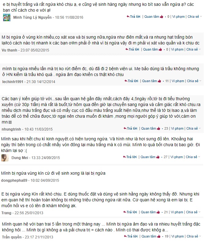 Ngứa vùng kín là bệnh thường gặp ở phụ nữ. Bệnh gây khó chịu trong cuộc sống hàng ngày cho chị em phụ nữ, song không nguy hiểm đến tính mạng nên chị em thường thơ ơ, ngại khám bệnh. Họ thường lên các diễn đàn để tìm hiểu. Sau đây là một số câu hỏi thường gặp.